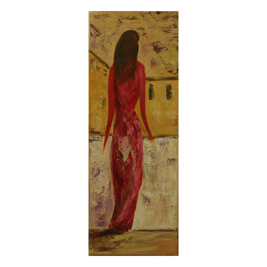 Ελαιογραφία με γυναικεία φιγούρα, ντυμένη με μακρύ κόκκινο φόρεμα